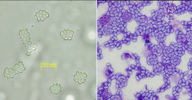 Quan sát dưới kính hiển vi điện tử cho thấy mỗi túi bào tử chứa (sporophorous vesicle) chứa tám bào tử Thelohania hoặc Agmasoma (Hình 3) tương tự như vi bào tử trùng microsporidian trong báo cáo trước đây trên tôm sú của tác giả Limsuwan (1991), Flegel và cộng sự (1992). Quan sát dưới kính hiển vi điện tử cho thấy những khối lớn màu trắng chứa nhiều túi bào tử.