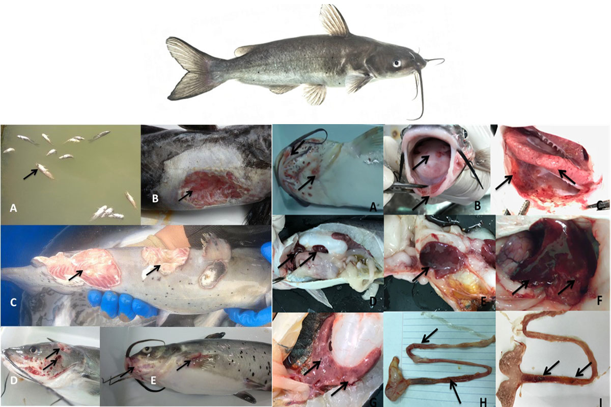 Khi bị bệnh cá thường có hiện tượng xuất huyết đặc biệt là gốc vây, xương nắp mang, hậu môn. Các cơ quan nội tạng như gan, ruột, thận, lách có hiện tượng xuất huyết, tụ máu và hoại tử.