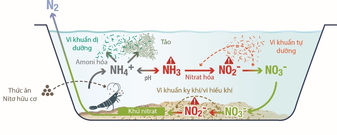 Trong ao nuôi, một trong những mối quan tâm chính của chất thải là Nitơ, thể hiện của hàm lượng NH3, NO2, NO3. NH3 được bài tiết bởi động vật và cũng sinh ra từ sự phân hủy mùn bã hữu cơ.NH3 là khí độc, nó có thể bị loại bỏ khỏi ao nuôi qua sự đồng hóa của vi khuẩn dị dưỡng, tảo và thực vật. NH3 cũng có thể được loại bỏ thông qua quá trình Nitrate hóa. Đây là chu trình 2 bước được thực hiện bởi vi khuẩn tự dưỡng (vi khuẩn Nitrate hóa). NH3 được chuyển hóa thành NO2 và sau đó chuyển hóa thành NO3.