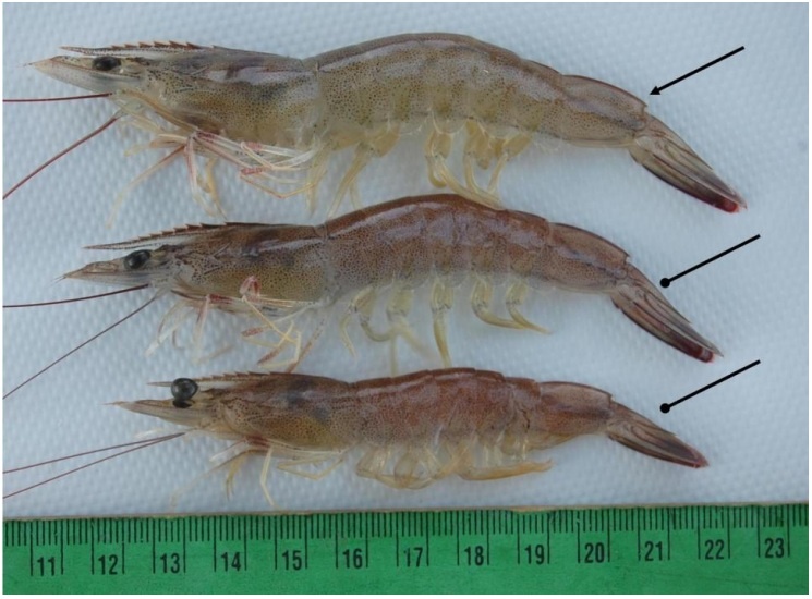 Dấu hiệu bệnh lý tôm có màu tối hoặc xanh tái, xanh xẫm. Tôm kém ăn, hoạt động yếu và sinh trưởng chậm (chậm lớn). Các phần phụ và vỏ kitin có hiện tượng hoại tử, có nhiều sinh vật bám (ký sinh trùng đơn bào, tảo bám và vi khuẩn dạng sợi). Gan tuỵ teo lại có màu trắng hơi vàng, thối rất nhanh. Tỷ lệ chết tích lũy có thể cao tới 70%.