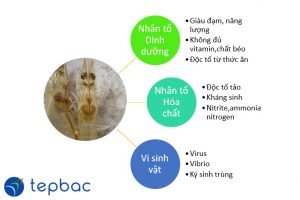 (1) Vi sinh vật: Vi khuẩn trong môi trường và vi khuẩn đường ruột luôn tác động qua lại với nhau qua các hoạt động tiêu hóa, thức ăn đi vào ruột, nước di chuyển qua đường miệng… Nếu vi sinh vật trong nước là vi sinh vật có lợi sẽ hỗ trợ cải thiện sức khỏe tôm, nhưng nếu hệ vi sinh vật trong nước chứa nhiều vi khuẩn có hại như V. alginolyticus, V. parahaemolyticus, V. harvey, V. vulnificus chúng sẽ gây bệnh cho tôm.