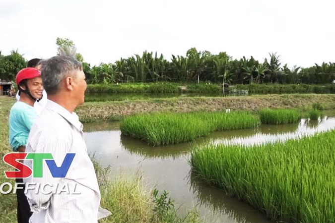 Sau khi thu hoạch tôm xong, nhiều ao vuông ở xã Gia Hòa 2, huyện Mỹ Xuyên đã phủ màu xanh của lúa. Nhờ mô hình tôm – lúa kết hợp mà thu nhập của nông dân được bền vững,