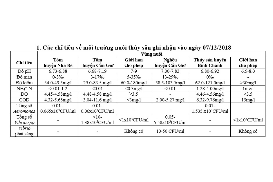 Sau đây là thông tin quan trắc môi trường của các vùng nuôi trồng thủy sản ở TP HCM và một số khuyến cáo kỹ thuật: a) Vùng nuôi tôm huyện Nhà Bè: Hiện nay các chỉ số DO, NH4+-N
