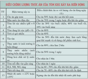 Qua thực tiễn, để lượng thức ăn được sử dụng hiệu quả bà con nên chia nhỏ lượng thức ăn thành nhiều lần ăn trong ngày (6-7 lần/ngày) hoặc các hộ có đủ điều kiện nên lắp đặt hệ thống máy cho ăn. Mặc dù sử dụng máy cho ăn thì người nuôi cũng cần điều chỉnh lượng thức ăn theo điều kiện cho ăn của tôm. Bởi trong quá trình nuôi sẽ có nhiều vấn đề xảy ra, có thể tham khảo điều chỉnh lượng thức ăn theo bảng: