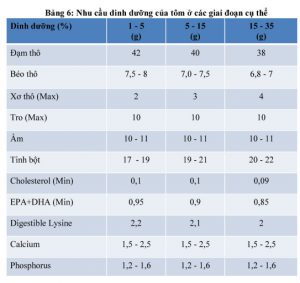 Nhu cầu dinh dưỡng tôm ở giai đoạn tôm giống cần phải cao, thường hàm lượng đạm tối thiểu 50% và chất béo 9 – 12%, sau đó tôm Postlarvae 15 được ương gièo đến 1 g nên dùng thức ăn có hàm lượng đạm tối thiểu 45% và hàm lượng chất béo khoảng 7,5 – 8,5%. Sau giai đoạn 1 g, nhu cầu dinh dưỡng cần đáp ứng như Bảng 6.