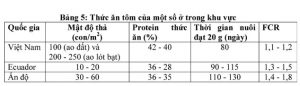 Nghề nuôi tôm ở Đông Nam Á, Ấn Độ và Mỹ Latinh (Ecuador) có mức độ thâm canh khác nhau nên nguồn thức ăn cũng có hàm lượng dinh dưỡng khác nhau. Các nước Đông Nam Á mật độ thả nuôi trong ao đất khoảng 80 – 120 con/m2, tại Ấn Độ, khoảng 30 – 60 con/m2 trong khi Ecuador ít hơn, chỉ 10 – 20 con/m2. Thức ăn TTCT ở các nước Đông Nam Á có hàm lượng đạm trung bình 38 – 42% và chất béo chiếm 7%, trong khi ở Ấn Độ hàm lượng đạm 35 – 36%, Ecuador hàm lượng đạm 28 – 36% và chất béo 6 – 9%. Tốc độ tăng trưởng và FCR cũng khác nhau ở các quốc gia (Bảng 5).