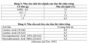 Tuy nhiên, thức ăn tôm dùng cho hệ thống nuôi thâm canh nên có tổng hàm lượng EPA và DHA tối thiểu 0,95% ở giai đoạn < 10 g và 0,9% ở giai đoạn > 10 g.