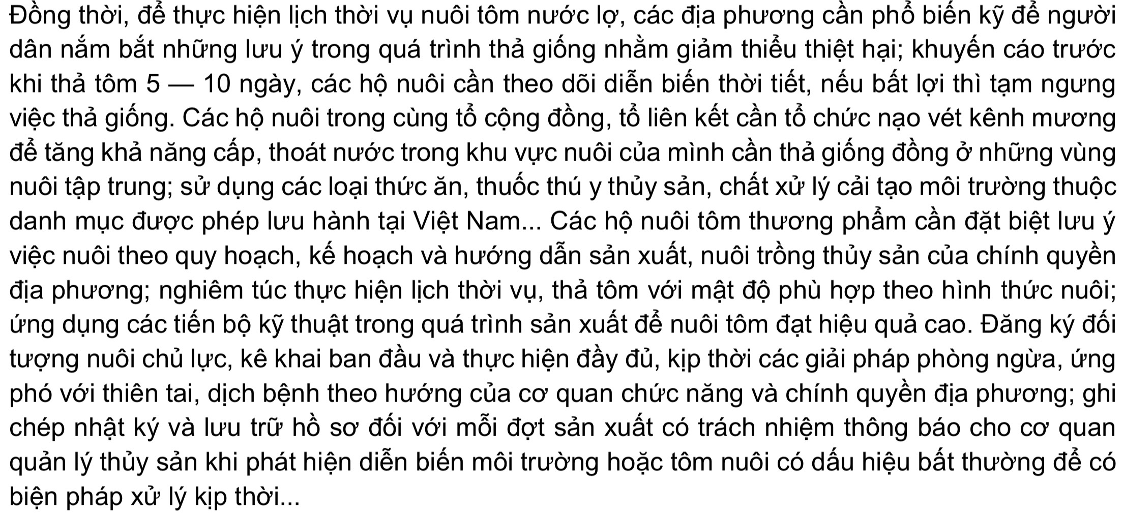 Sở NN&PTNT Trà Vinh đề nghị UBND các huyện, thị xã, thành phố trong tỉnh tuyên truyền và khuyến cáo người nuôi hạn chế thả giống trong giai đoạn ngày khi thời tiết có nhiều chuyển biến phức tạp. theo dõi diễn biến thời tiết môi trường chờ đến khi nhiệt độ ổn định trong khoảng 27 – 33°C mới tiến hành thả giống để hạn chế rủi ro thiệt hại.